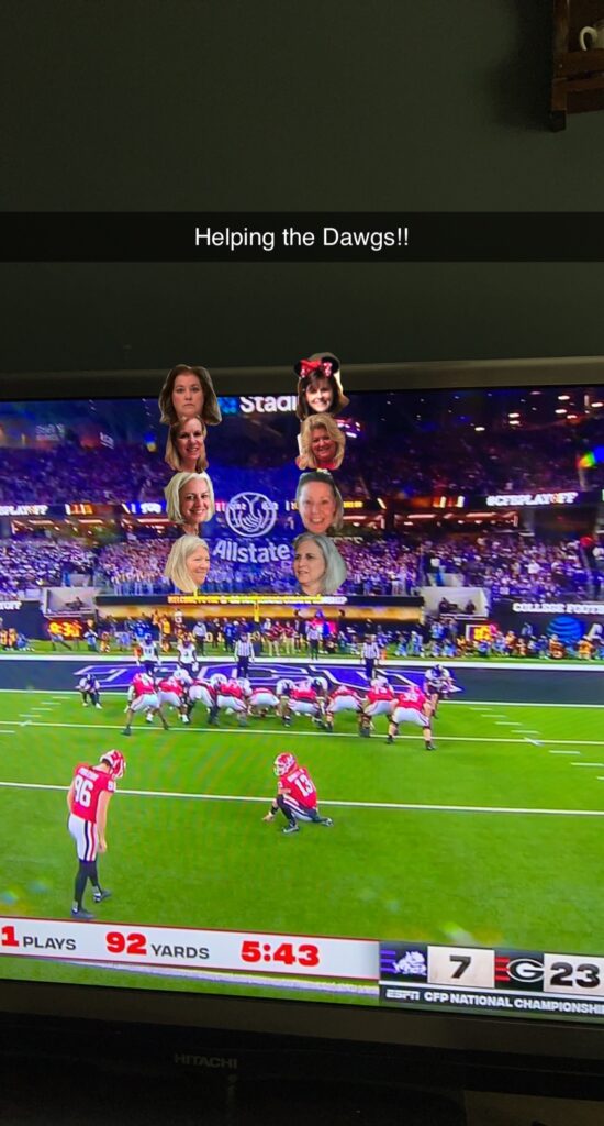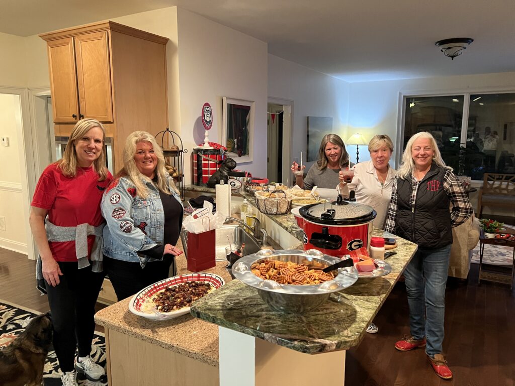 We met at Julie’s house to watch the UGA vs. Tennessee game. We cheered and ate and guessed the score. Terri was the winner of the score contest but we also exchanged football themed gifts just for fun. We had unseasonably warm weather and enjoyed watching the game on the screened porch. Kim made some Bower’s Blend Martinis, Gina made some Bennett Bars, and Julie made Kirby’s Weenies (or something like that.)